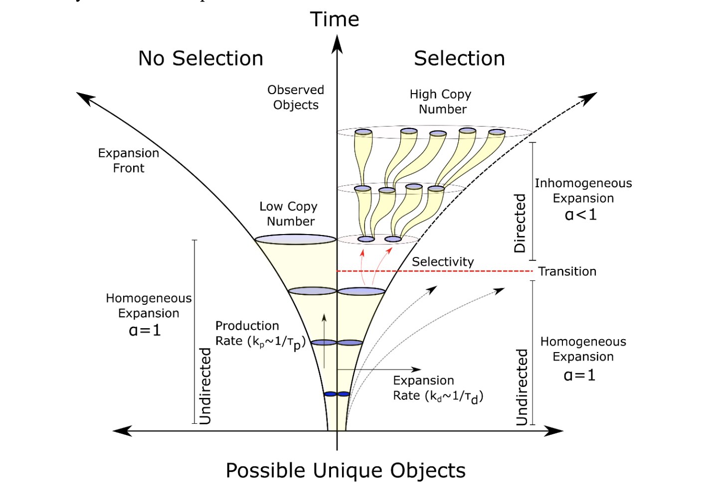 The selection process is defined by a transition from undirected to directed exploration. Undirected exploration leads to the fast homogeneous expansion of discovered objects in the assembly space, while directed exploration leads to a process more like a depth first search. pdf ![]()